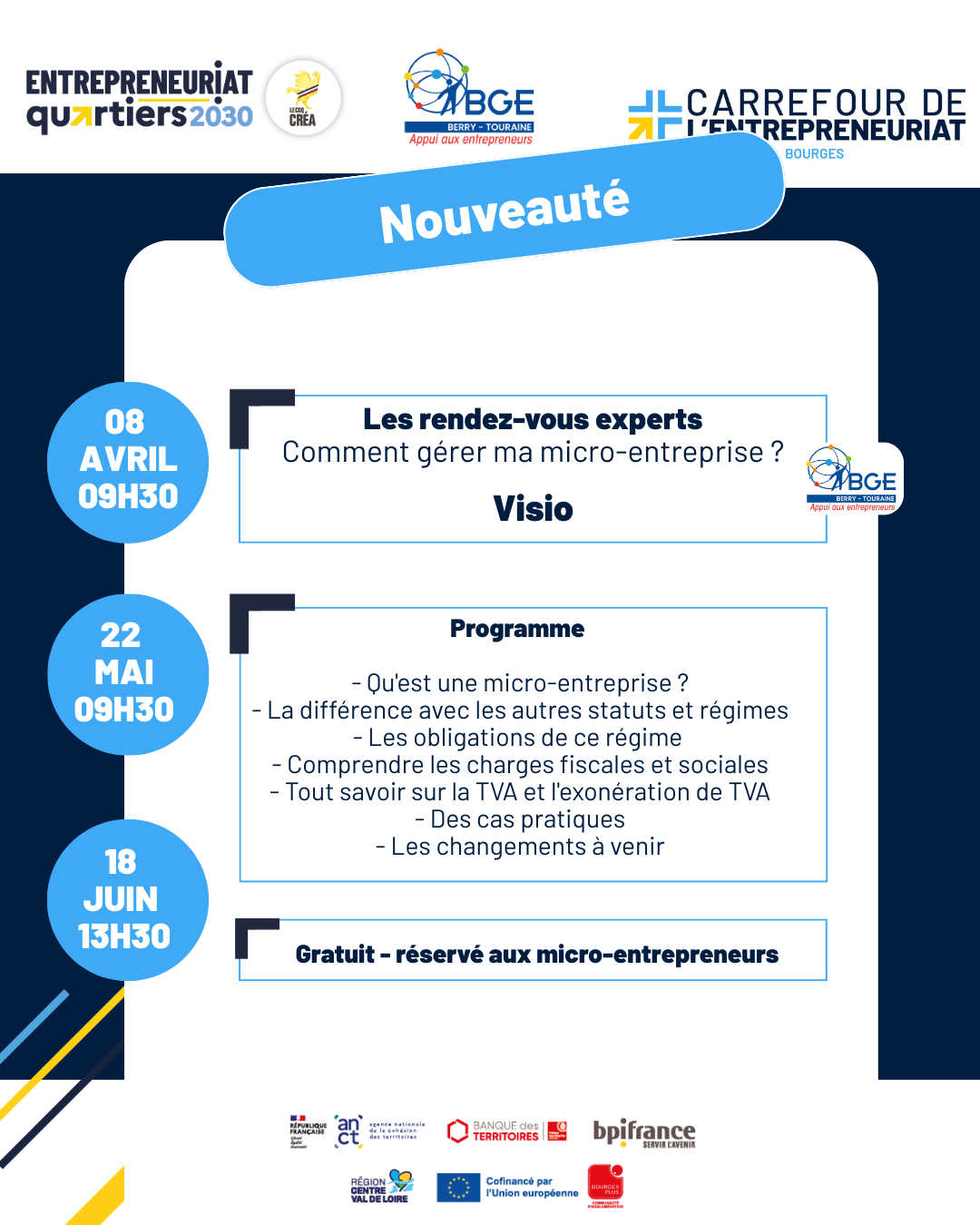 BGE BERRYTOURAINE te propose un atelier afin de développer ton projet de création d'entreprise ! Tu veux créer une entreprise, tu as déjà une idée d'activité, tu sais ce qu'il te faut pour bien démarrer. Et si je te disais qu'avec cet atelier, tu peux aller plus loin ? Je te propose de challenger ton […]
